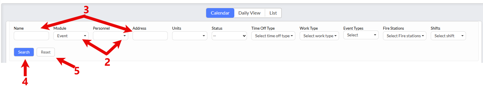 Click the "Search" button to apply filters and display filtered results in the calendar