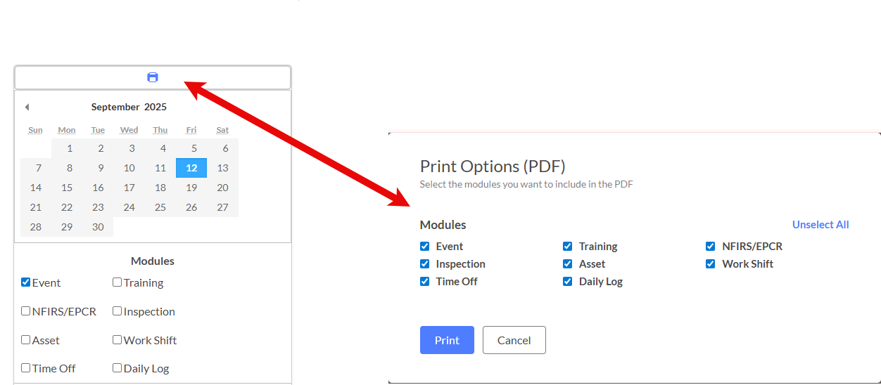 Q: The print function creates a PDF but it doesn't include all the events I can see on screen. Why not? A: The print function allows you to select which specific events to include in the PDF. Make sure you've selected all the events you want to print before generating the PDF. Only checked/selected events will appear in the printed document.