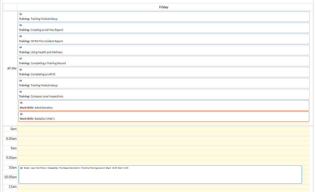 The Activities Log Daily Overview serves as a comprehensive daily planning and activity management tool that consolidates activities from multiple First Due modules into a single-day calendar format. This view is particularly valuable for supervisors, dispatchers, and administrative personnel who need to understand daily department operations at a glance.