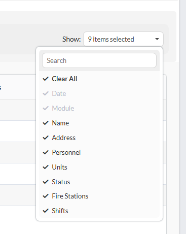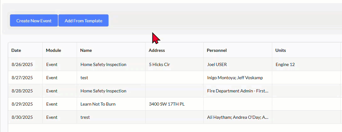 The Activities Log List view provides a centralized interface for viewing, searching, and managing all activities and events across multiple modules within the First Due system. This comprehensive overview enables users to efficiently locate, filter, and access activities from Training, Incident Documentation, Inspections, Assets, Scheduling, Events, and Daily Log modules in a single consolidated list.