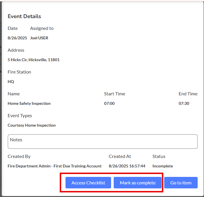 The Activities Log serves as a unified dashboard that aggregates activities from various First Due modules, eliminating the need to navigate between different sections to view department activities. This cross-module integration displays assigned training sessions, open or incomplete EPCR or NFIRS reports, scheduled inspections, completed asset or apparatus checks, time off requests, work shifts, events, and daily log activities.