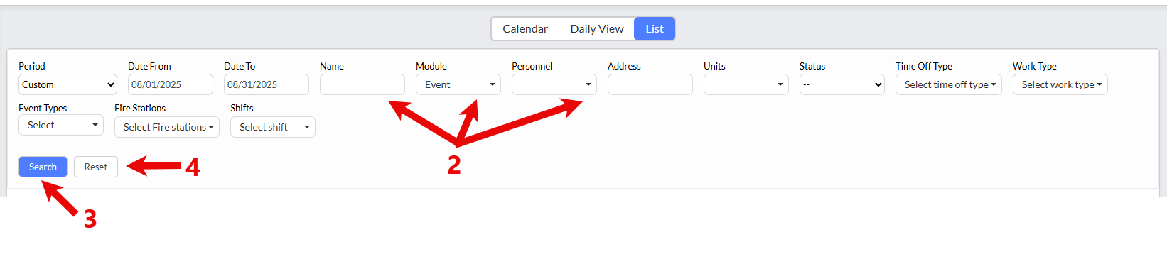 The List view is specifically designed for users who need to search, filter, and analyze activities across multiple data points. It provides advanced filtering capabilities and customizable column displays to help users quickly locate specific activities or analyze activity patterns across the department.