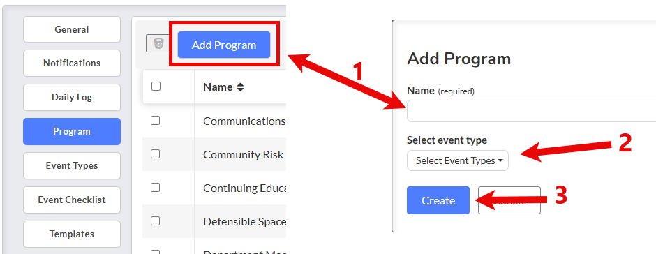 Programs serve as the top-level organizational structure within the Events and Activities module, functioning as umbrella categories under which related event types can be grouped. This hierarchical approach enables departments to organize events by operational areas, specializations, or administrative divisions while maintaining flexibility in event type assignments.