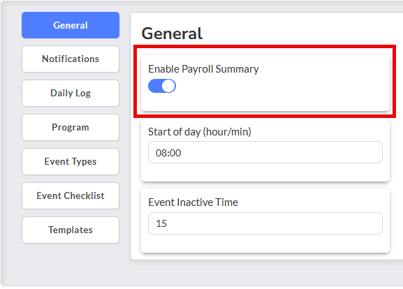 Q: I enabled payroll summary but don't see the tab in event creation. What's wrong? A: After enabling payroll summary in the General setup, you may need to refresh your browser or log out and back in for the changes to take effect. Also verify that you have the appropriate permissions to access payroll summary functionality within events.