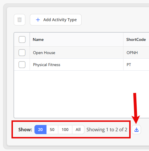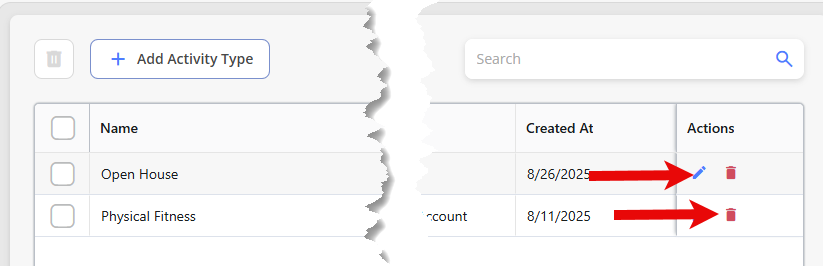 Delete: Use the trash can icon to remove activity types (requires confirmation)