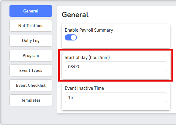 Q: Can different departments within our organization have different start of day times? A: The start of day setting is system-wide for the Events and Activities module. If your organization has multiple departments with significantly different schedules, you may need to choose a setting that works for the majority or contact your system administrator about advanced configuration options.