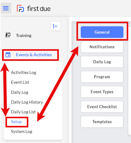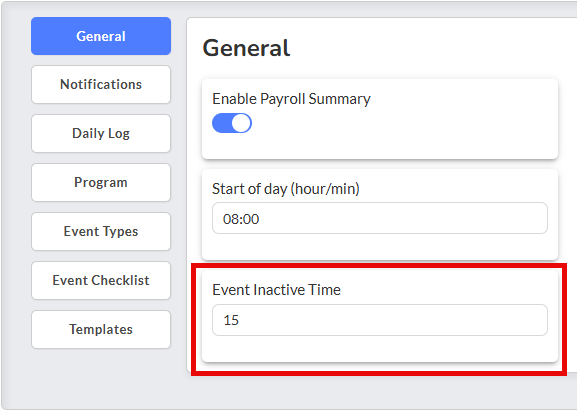The General section in Events and Activities Setup provides essential administrative configuration options for system-wide event management functionality. This interface enables administrators to control payroll summary features, establish default timing parameters, configure user session management, and integrate with activity types for comprehensive event and activity management across the department.