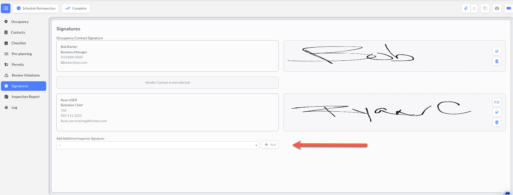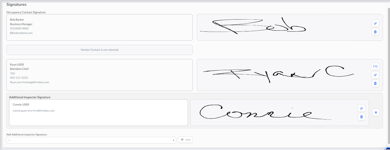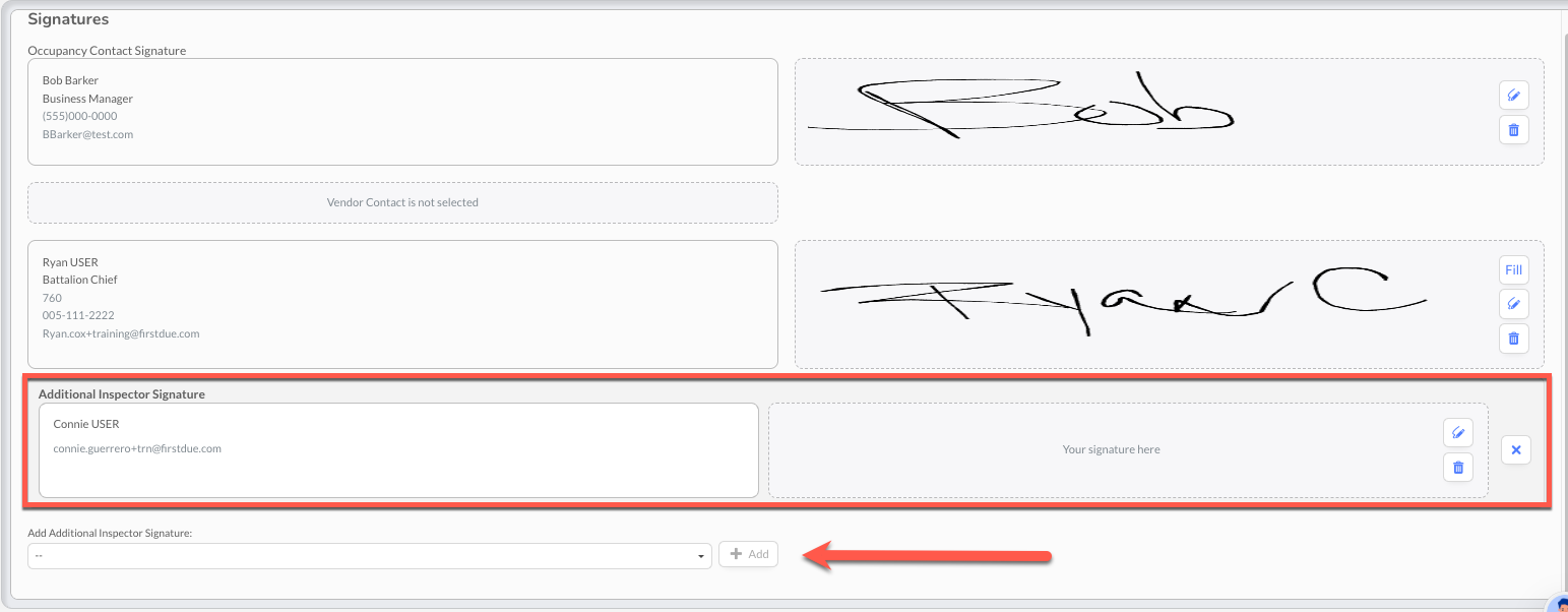 The Multiple Inspector Signatures feature allows fire departments to document and capture digital signatures from all inspectors who participate in team inspections. This feature ensures accurate accountability, meets compliance requirements, and reflects the reality of how complex inspections are conducted with multiple personnel.