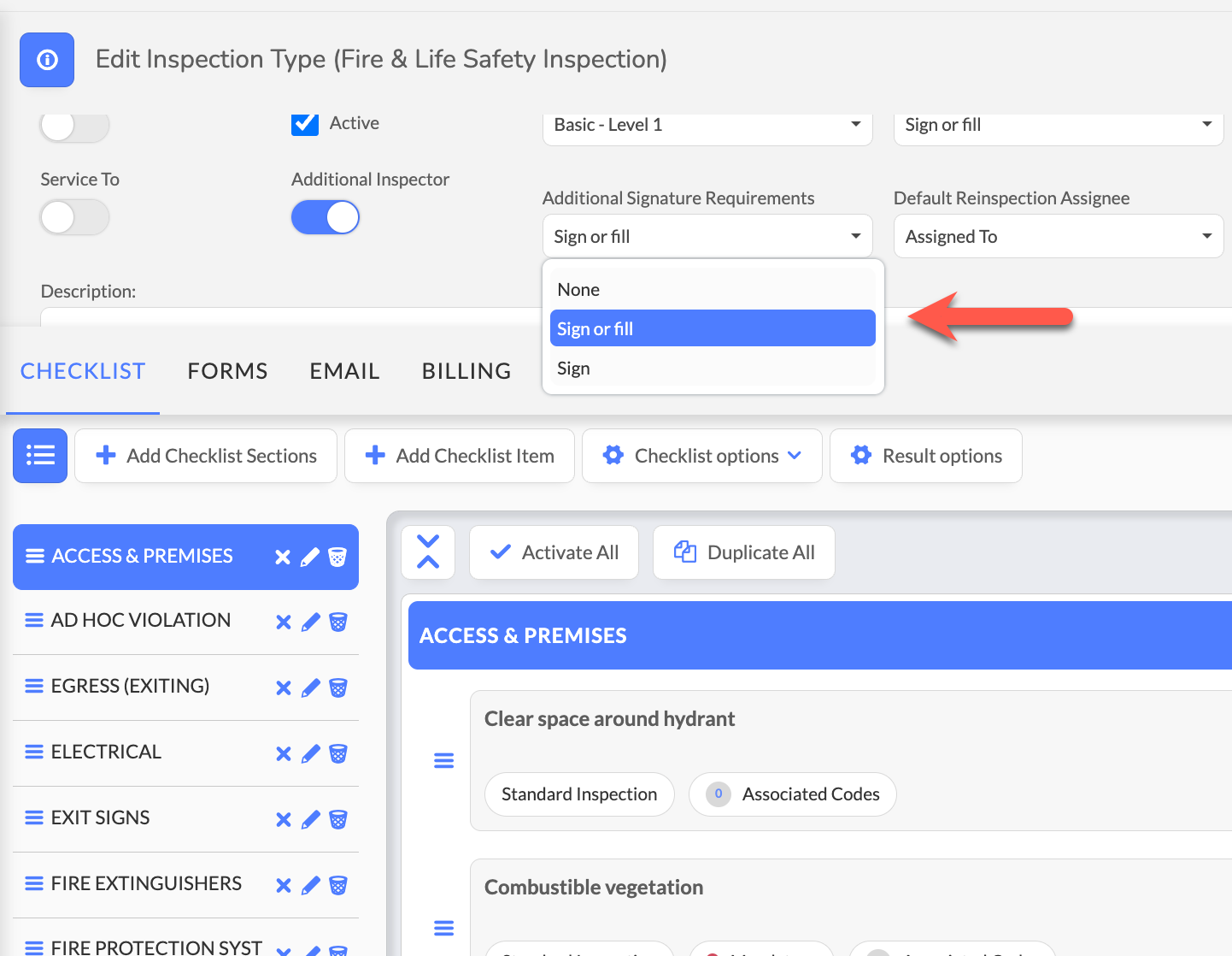 Choose Sign requirements for inspections requiring legal accountability