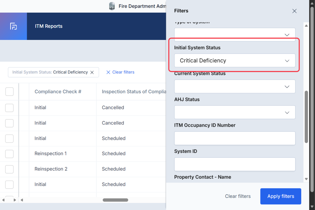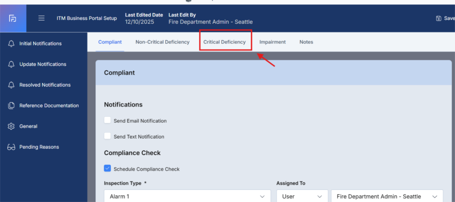 When service providers perform ITM services on fire protection systems (such as sprinkler systems, fire alarms, or suppression systems), they submit reports through the Business Portal documenting the system status. When a system is found to have a Critical Deficiency—meaning it has a condition that significantly impairs the system's ability to protect the building—fire departments need to conduct a follow-up Compliance Check inspection to verify the deficiency has been corrected.