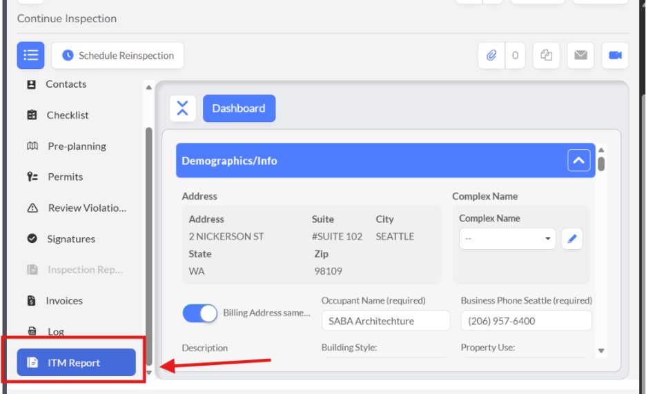 23. While in the inspection checklist, click on ITM Report tab or button.