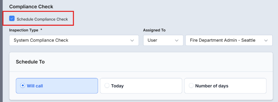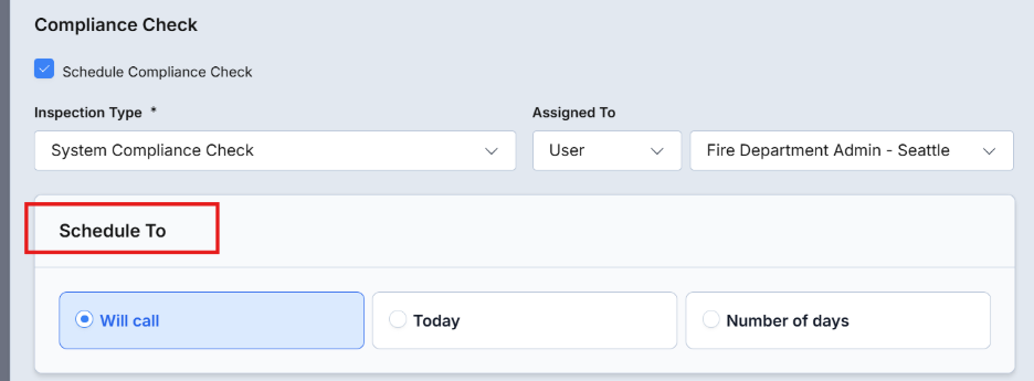 Use Will Call scheduling for Compliance Checks when inspector availability varies or property access requires advance coordination
