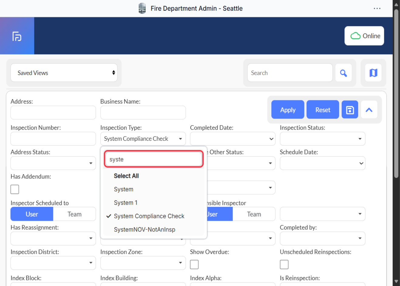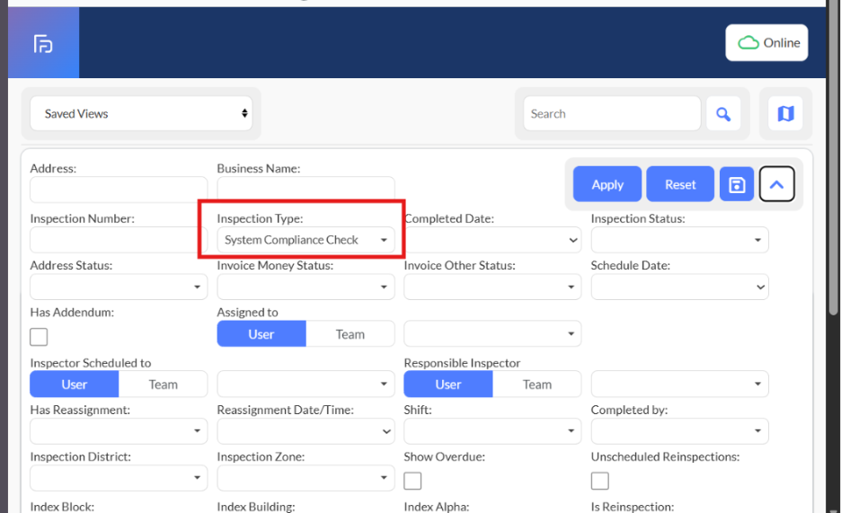 Inspection Status of Compliance Check to find inspections that are Scheduled, In Progress, Ready to Review, etc.