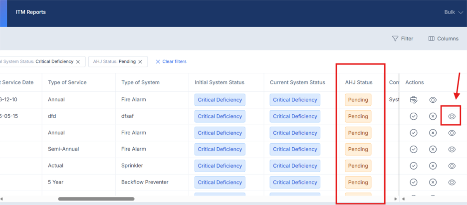 7. Identify reports showing Pending status and click the eye icon next to a report to view full details.