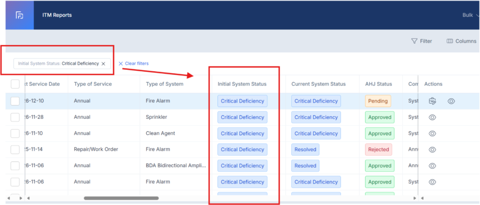 6. The list now displays only ITM reports flagged with Critical Deficiency status.