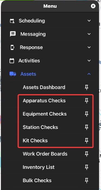 - What: Updated Assets module menu labels from "Checks" to "Overview" terminology including Apparatus Overview, Equipment Overview, Location Overview, and Kit Overview