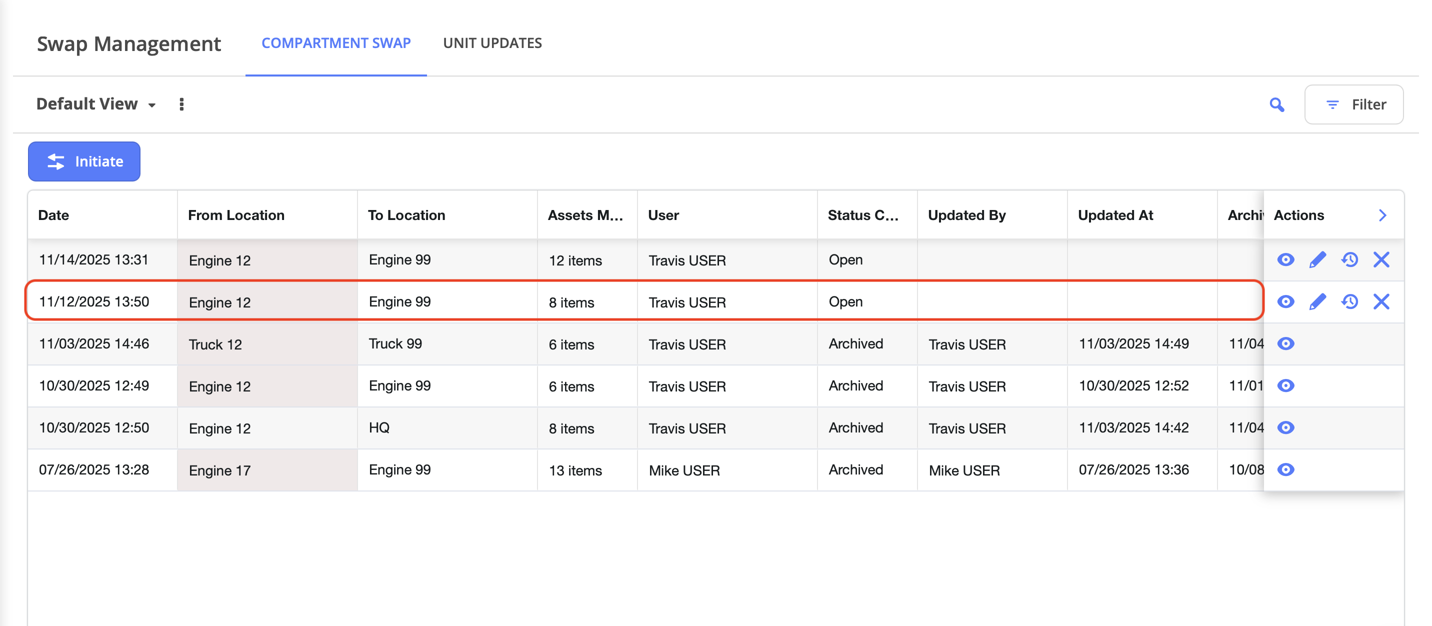 Browse or search the Swap History list to find the specific swap you need to reverse. Use filters or the search function to quickly locate swaps by date, apparatus, or equipment, kits, and inventory.