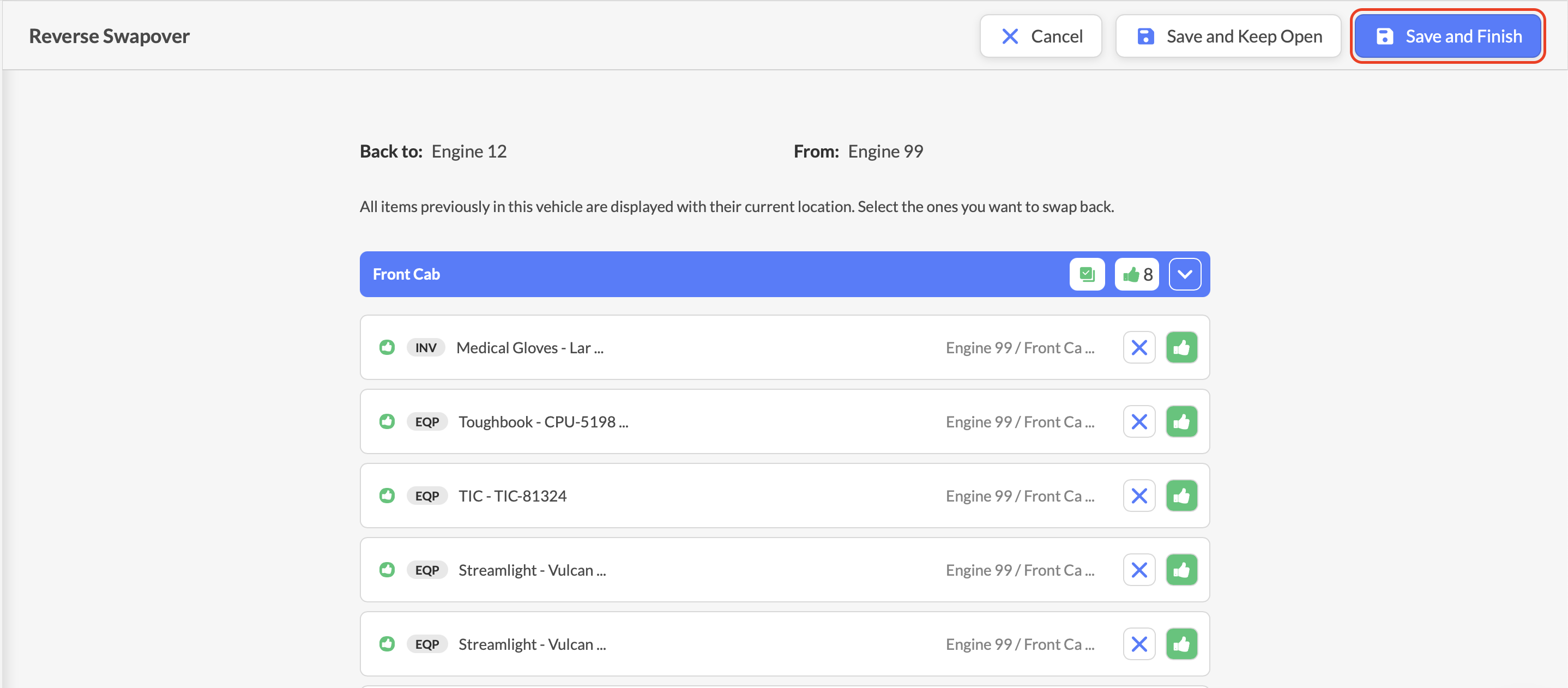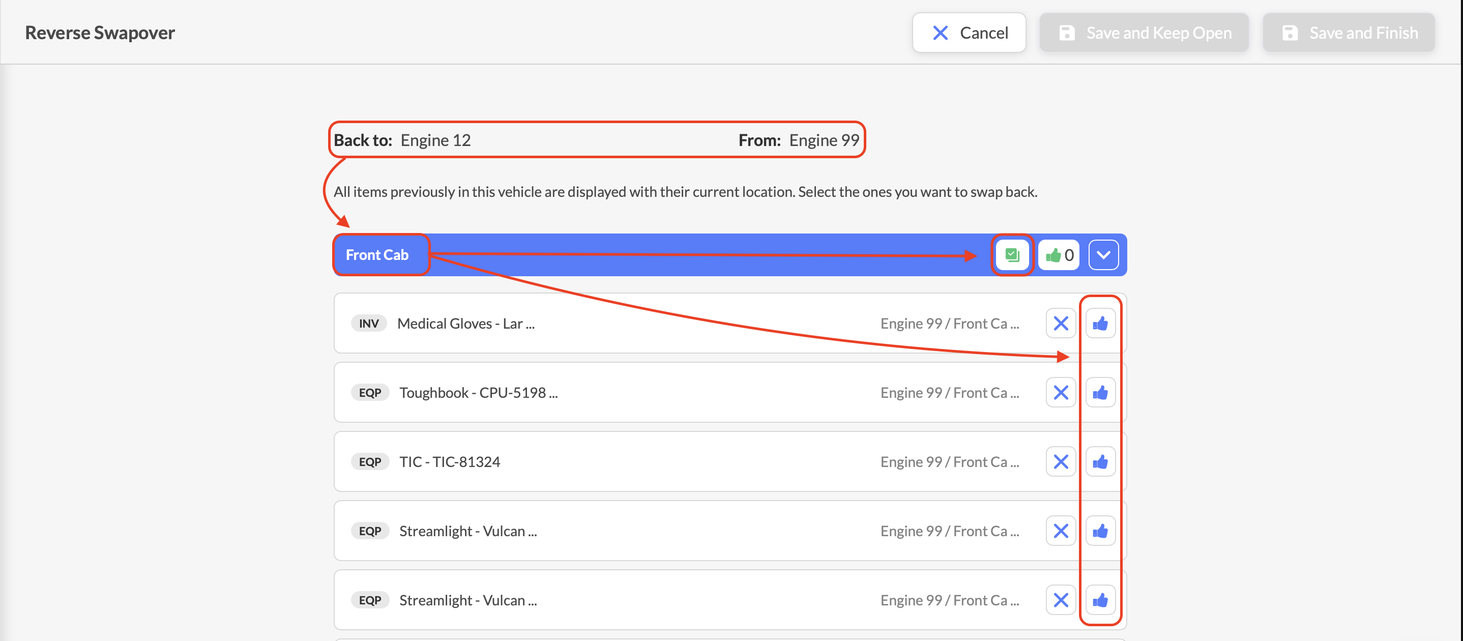 Review the list of equipment, kit, and inventory items that were transferred during the original swap. Select the Thumbs Up icon for each item you want to move back to the original apparatus. For bulk approval, select the Check Box at the top of each compartment.