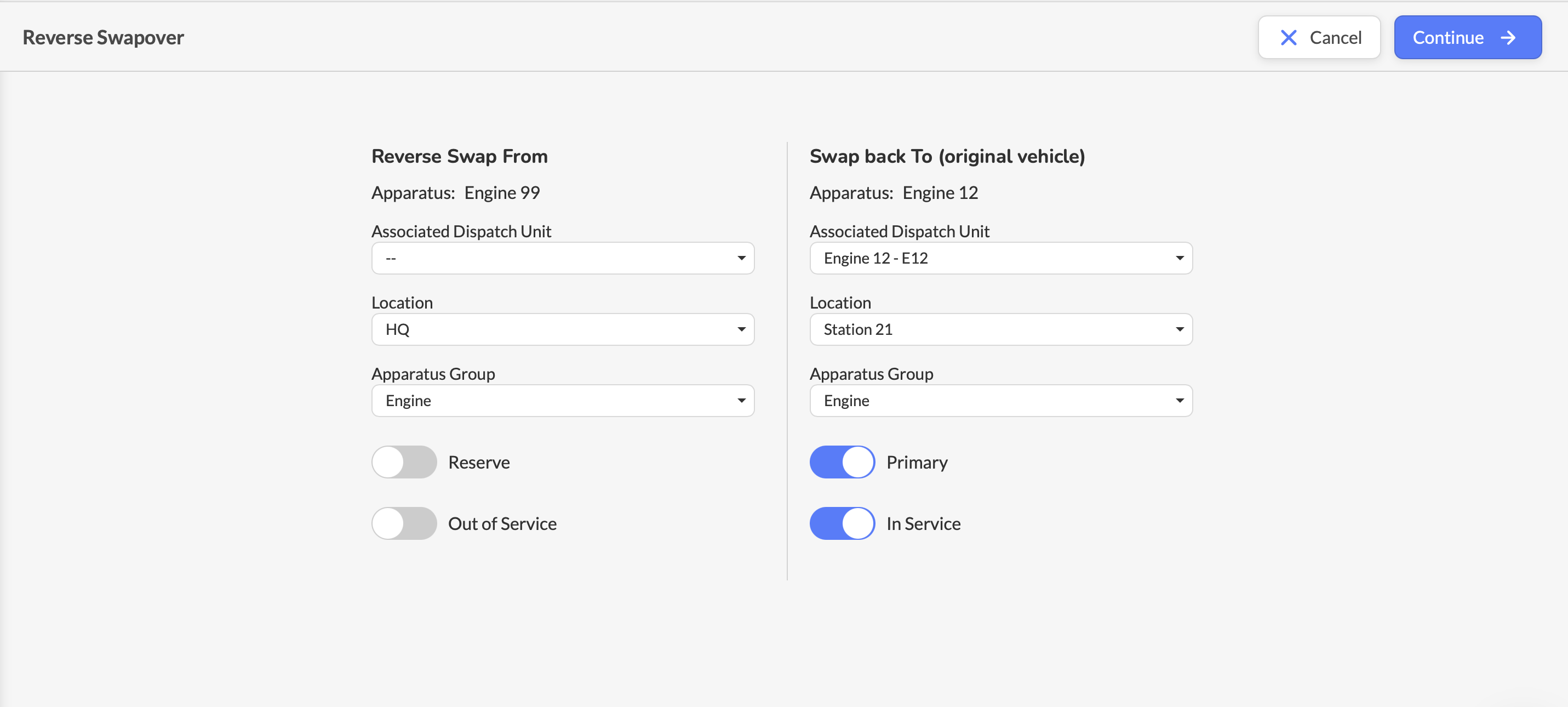 Reversing a swap is a flexible process—you can move all items back to the original apparatus or selectively return specific equipment, kits, and inventory based on operational needs.