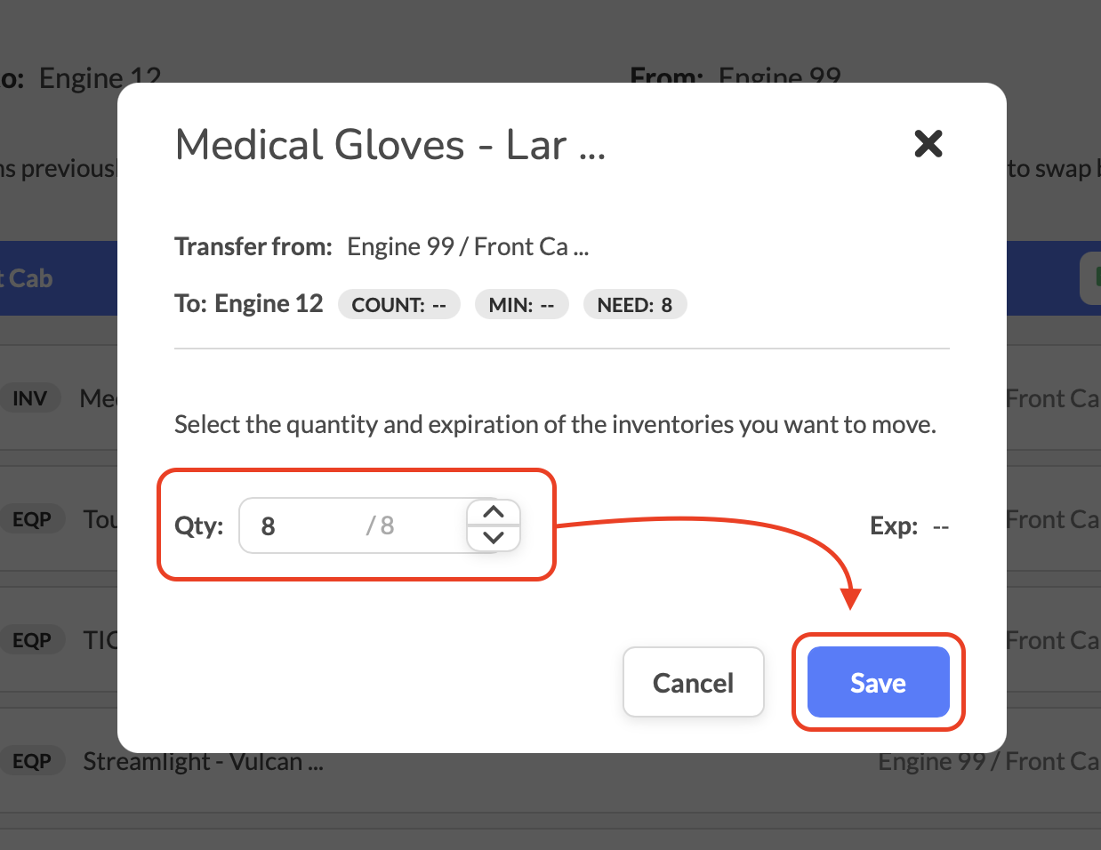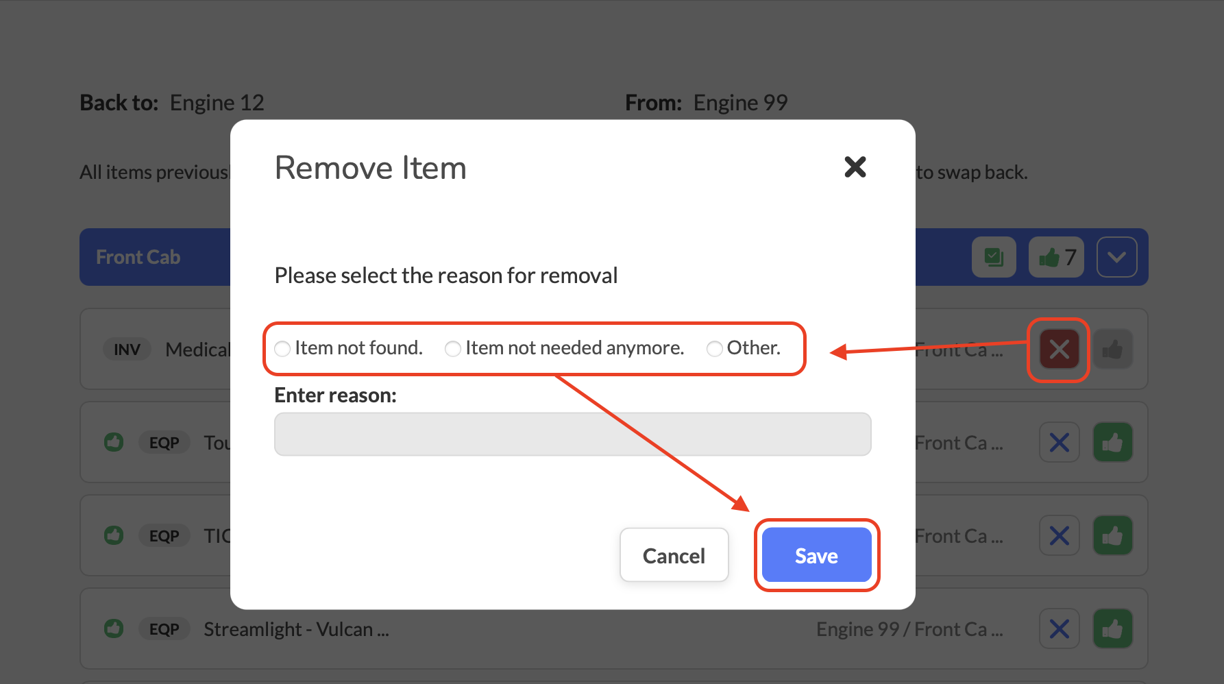 Important Note: Any equipment or inventory items that were moved from the apparatus they were swapped to after the original swap will not appear in this list and cannot be reversed through this process.For inventory or equipment that is not being moved or not present from the list, selecting the X icon will prompt the user to input why that equipment or inventory is no longer present.