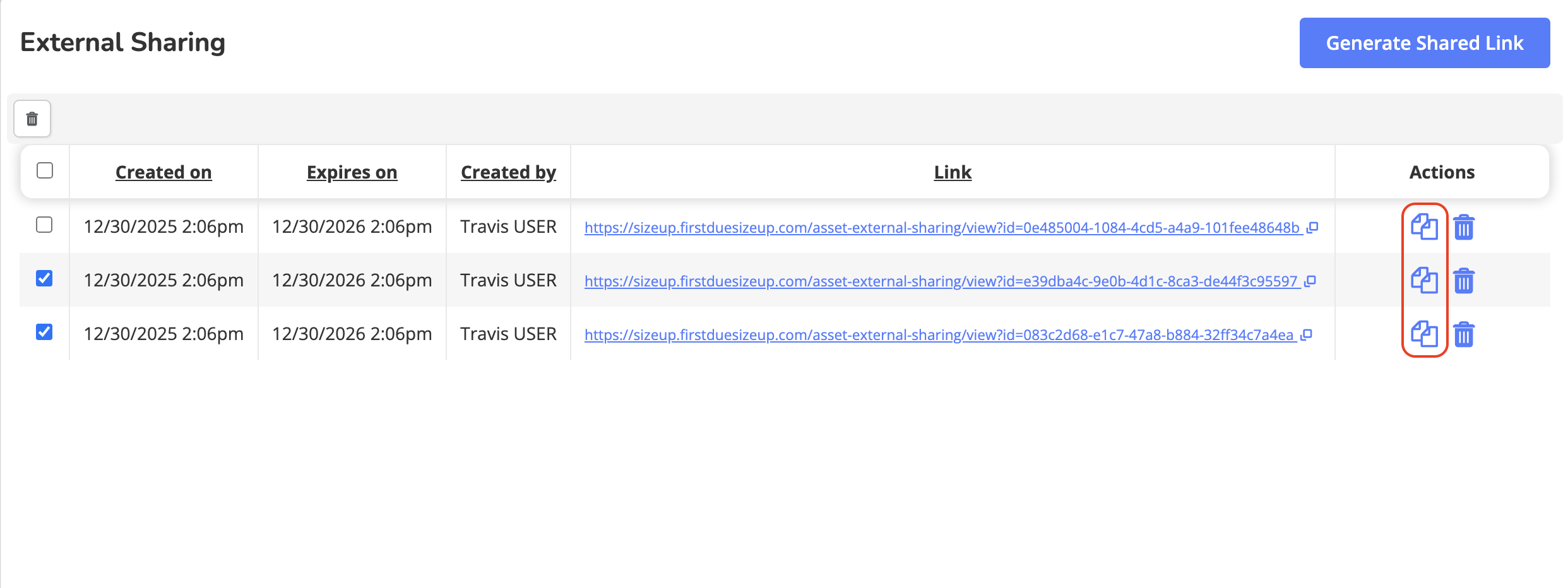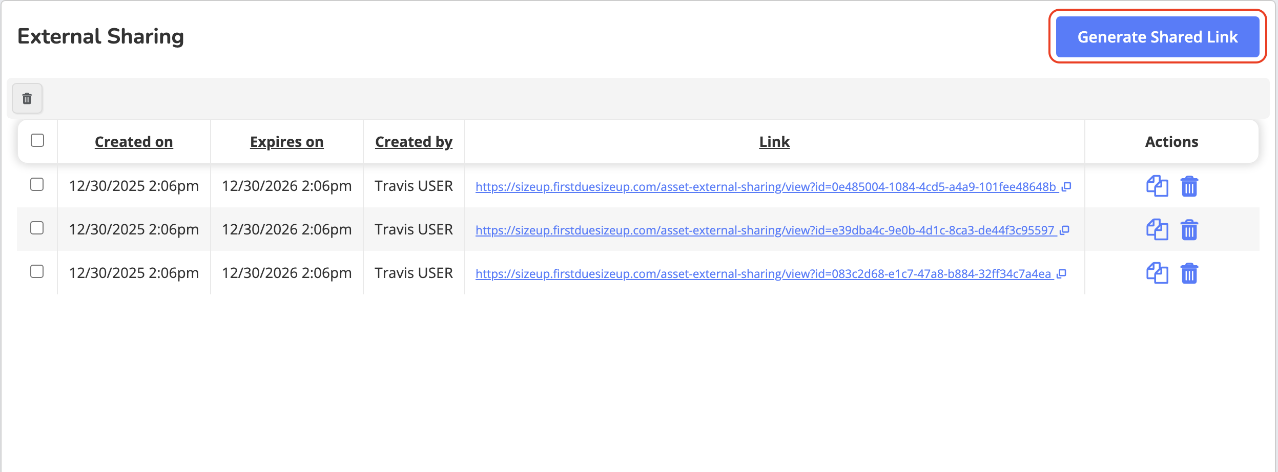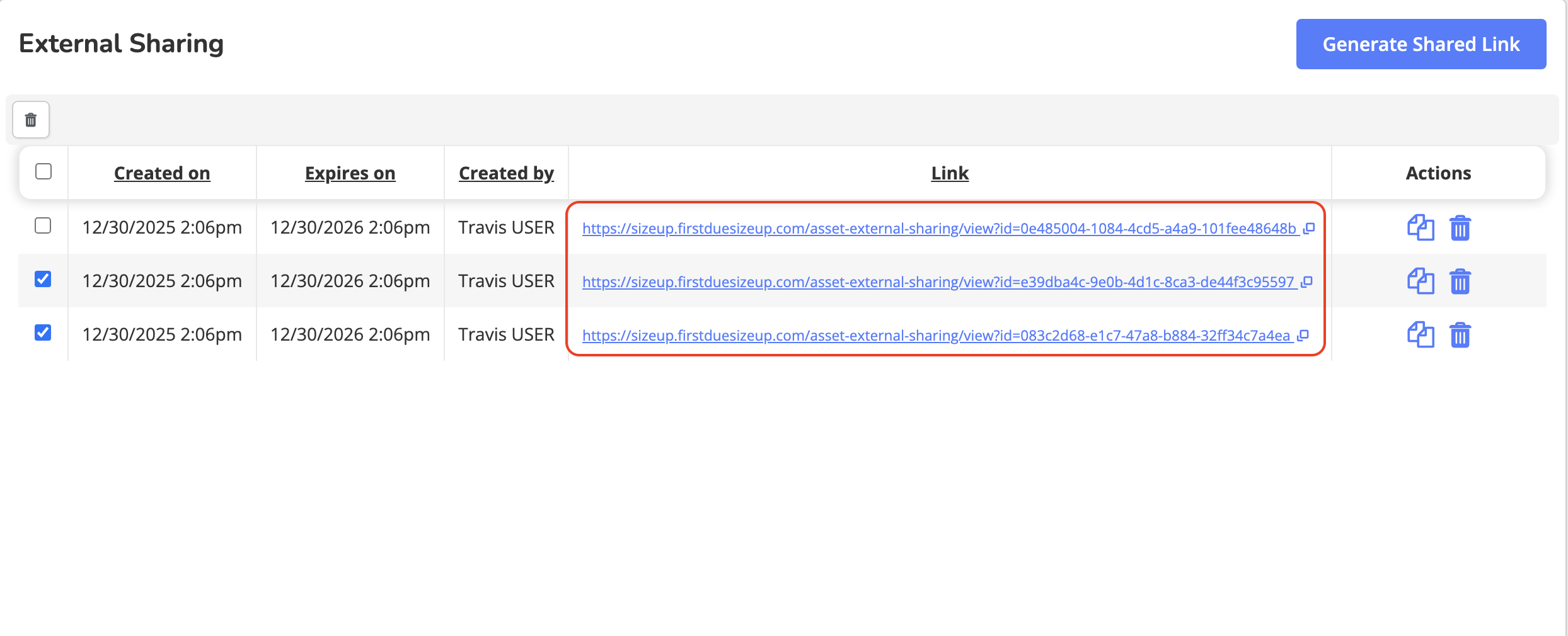 Each link remains active for one year from creation unless manually deleted.