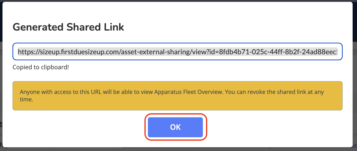 Note: Apparatus Fleet Overview links are accessible for one year from the date of creation, but they can be revoked at any time.Scroll through the External Sharing list to view previously created links