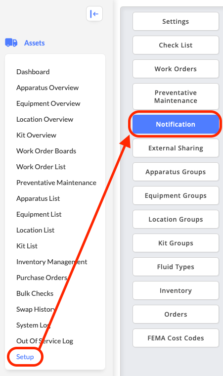 Automated notifications are essential for proactive asset management in fire and EMS operations. The Notifications feature sends email alerts from assets@firstdue.com when specific conditions are met, such as idle work orders, overdue checklists, or items approaching expiration dates.