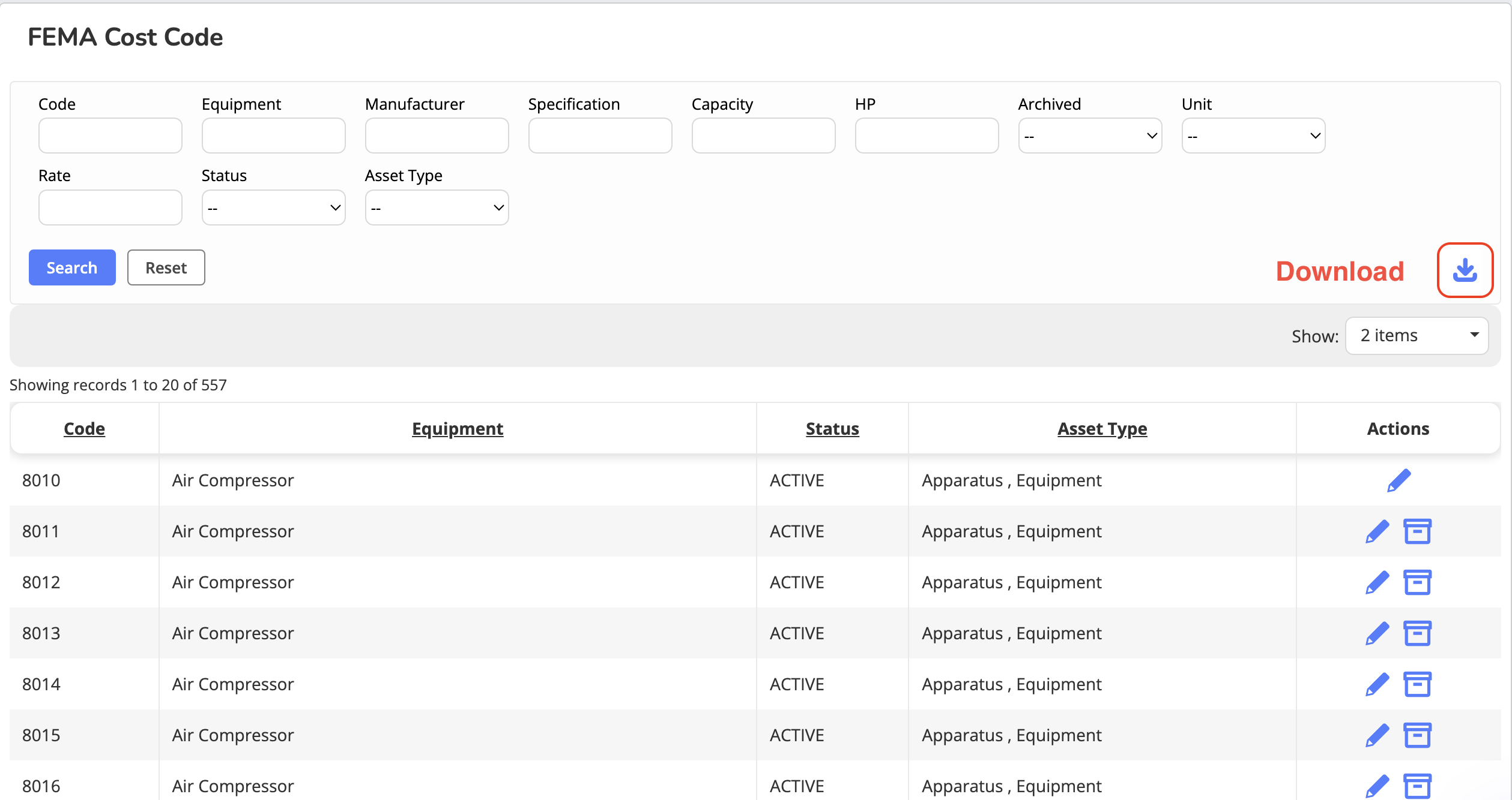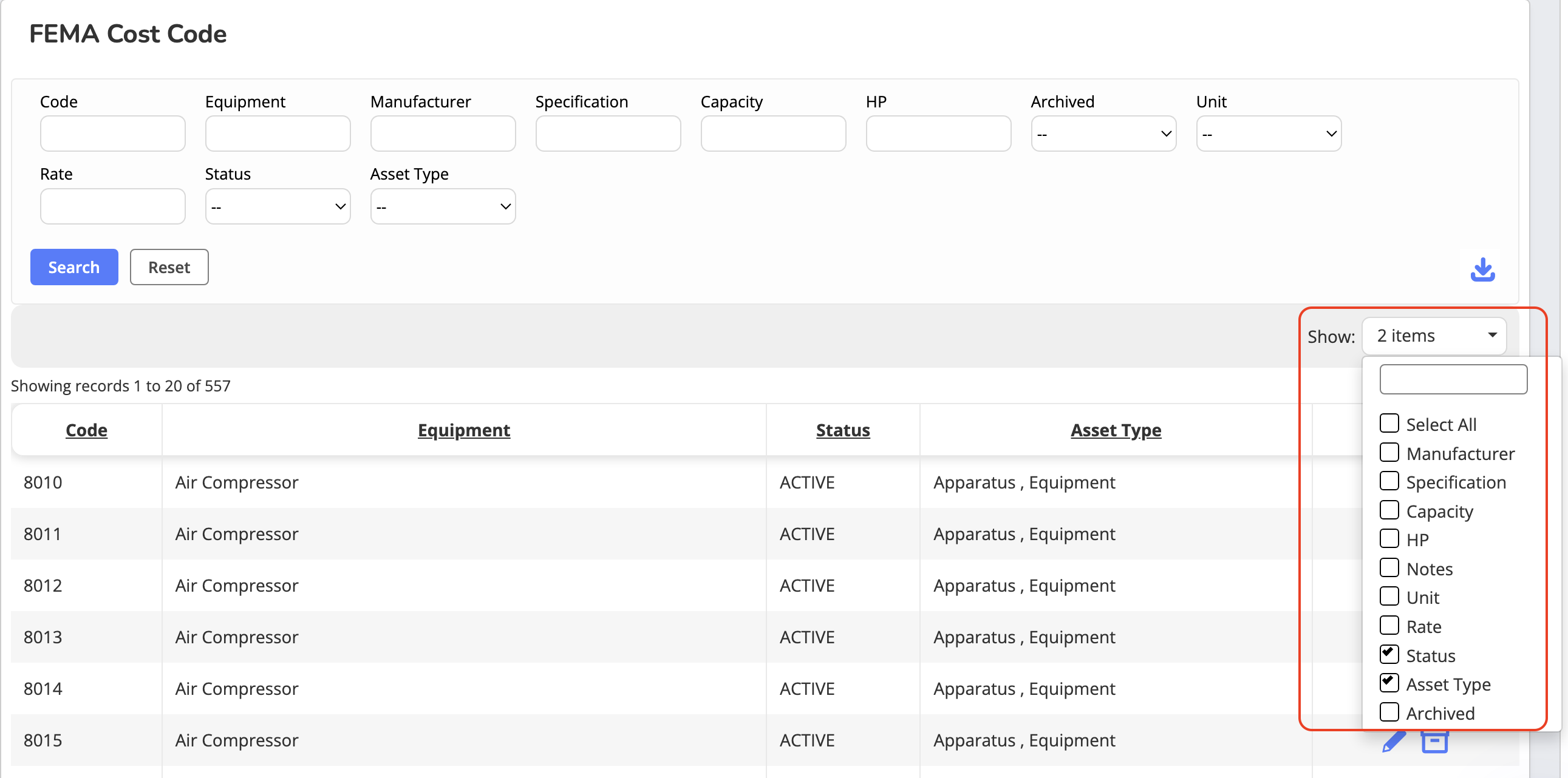 Active codes are available in Equipment and Apparatus specifications under FEMA Cost Code.