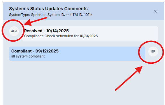 This modal displays the complete comment timeline as well as shows you several important details such as the Role label which tells you who made the comment - 'AHJ' means it came from the fire department, and 'BP' means it came from your company.
