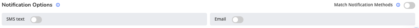 Both SMS and Email notification channels are available with identical configuration fields. You can configure them independently or use the matching feature (described in Step 7) to synchronize settings across both channels.