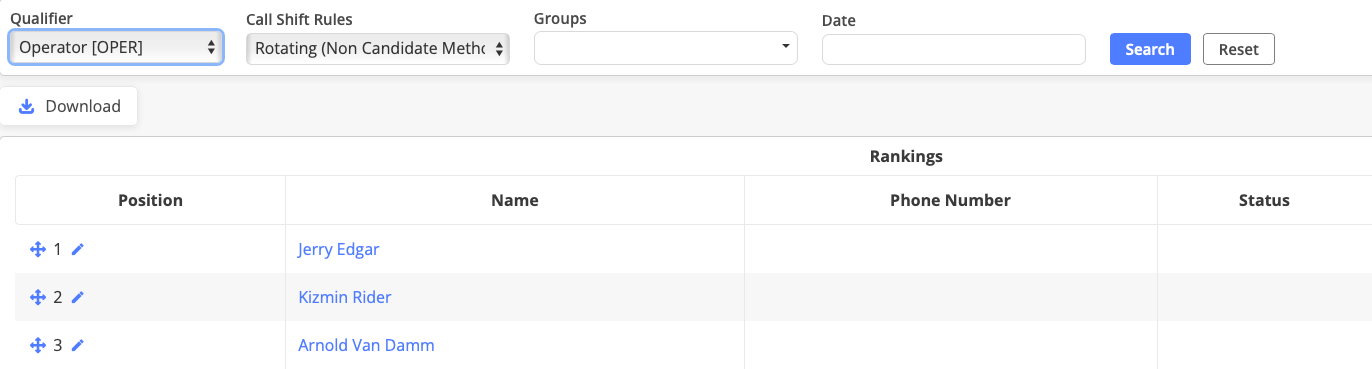 From the Call Shifts interface, click on the "Ranking" tab located at the top of the screen. This opens the rankings interface where you can view and manage personnel order for all configured qualifiers.