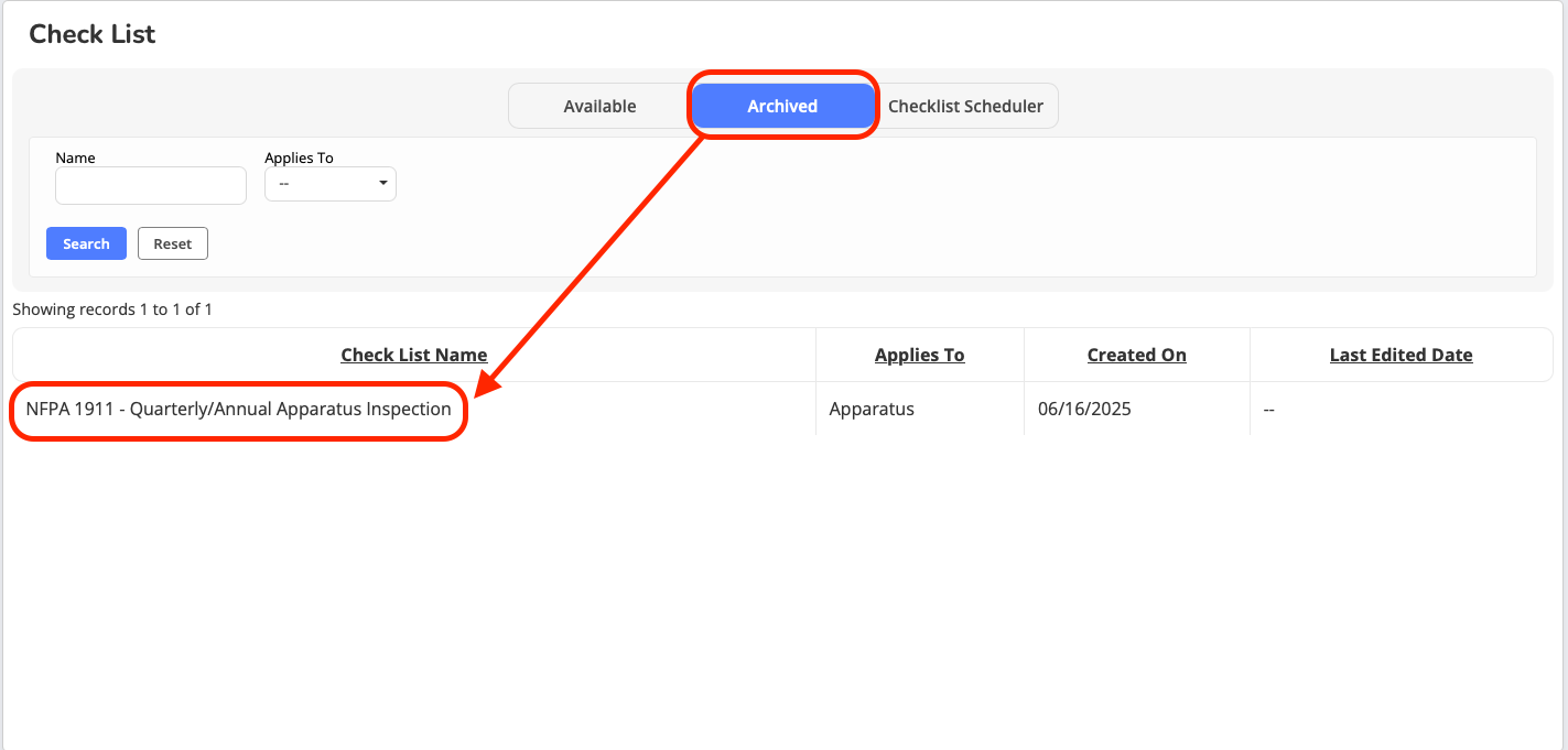 Q: Where can I find archived checklists? A: Navigate to Assets > Setup > Checklist, then click on the Archived tab at the top of the checklist list. Archived checklists can be viewed but not edited or reactivated.