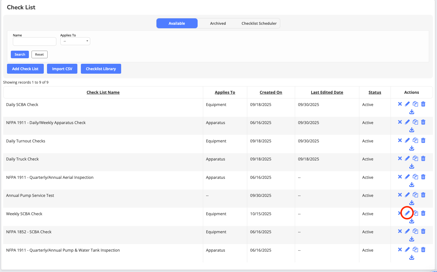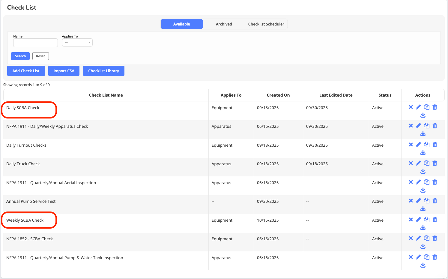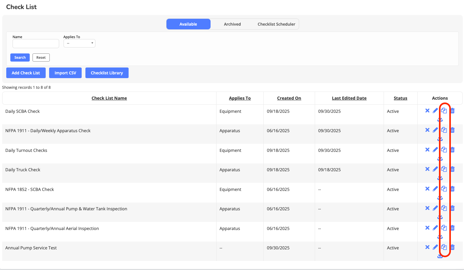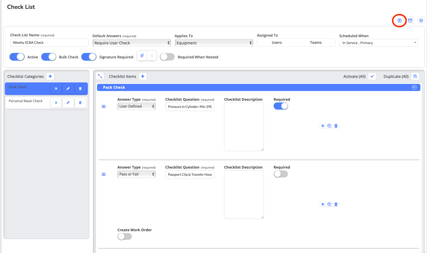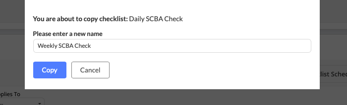 Example Use Case: Once a week, a more in-depth weekly apparatus check may be required beyond the daily check. Simply duplicate the daily check and then add the additional weekly checklist items to the newly created Weekly Apparatus Check.