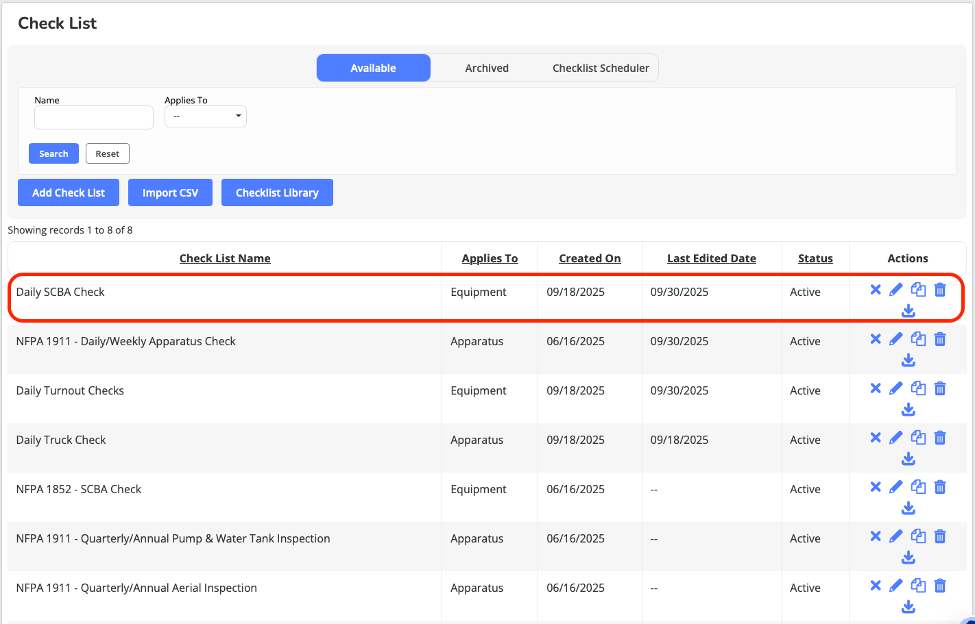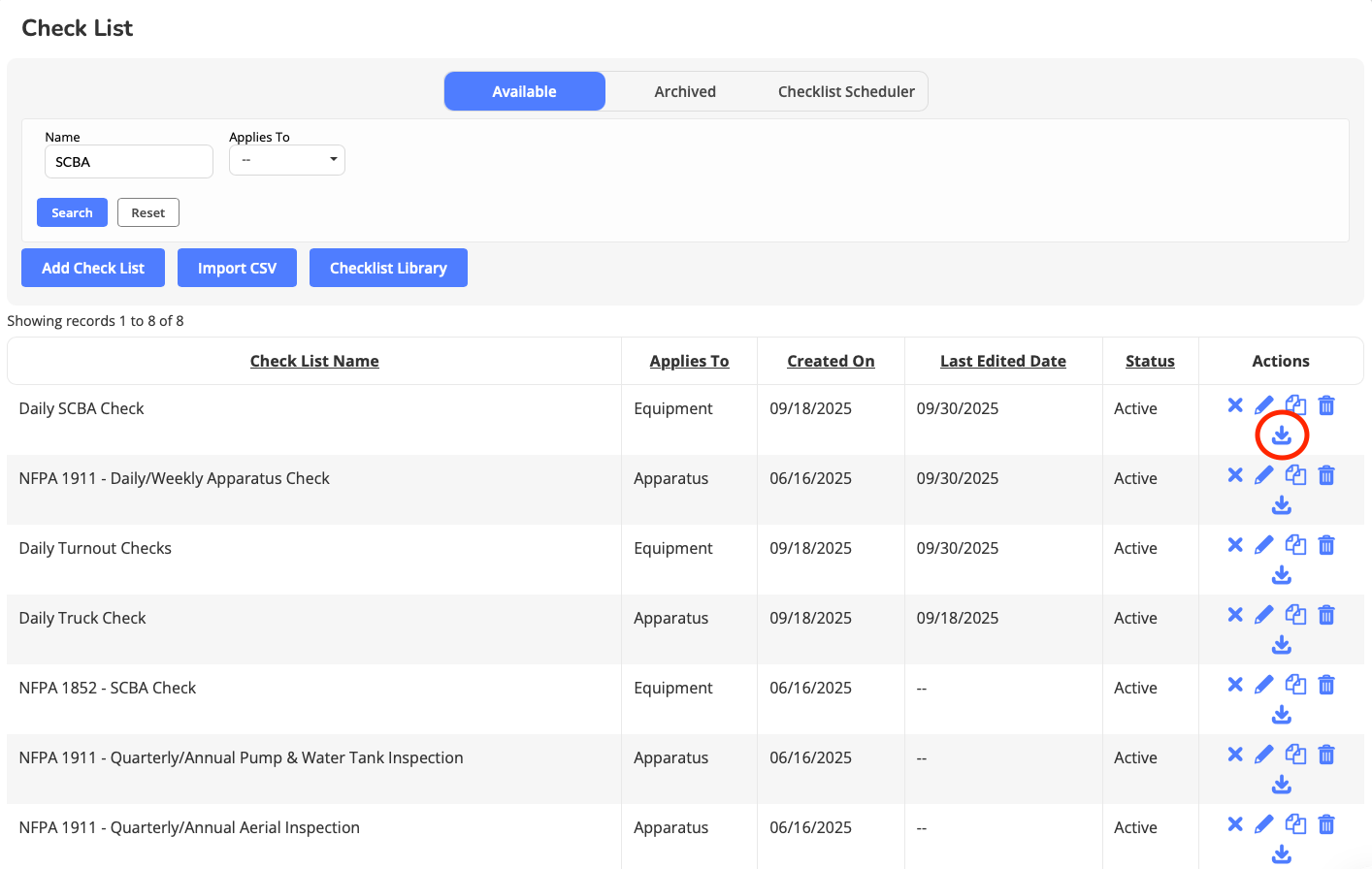 In the Actions column for your selected checklist, click the Download icon (typically represented by a downward arrow or download symbol).