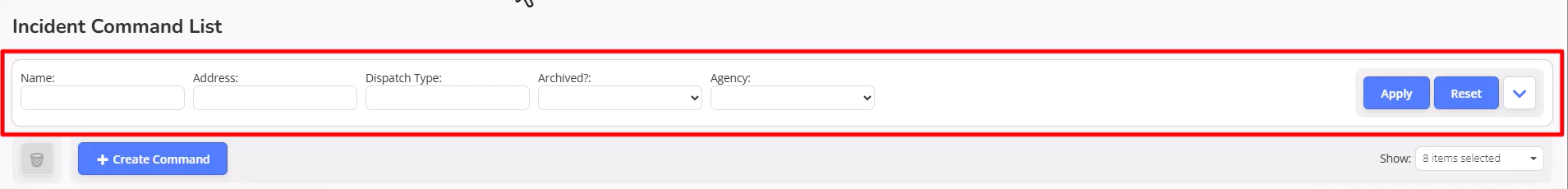 Use the search and filter area at the top of the list to locate specific incident commands. Available filter options include: