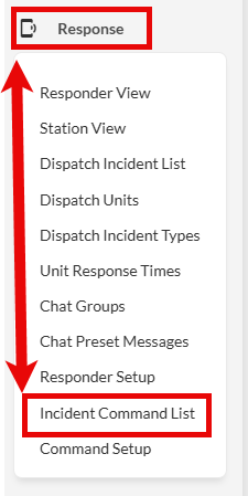 Navigate to the Response module in your First Due system and select "Incident Command List" from the module menu.