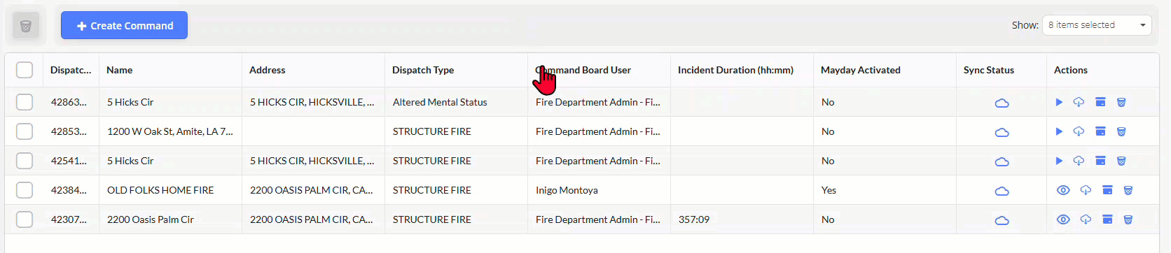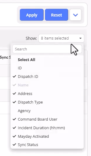 By default, eight columns are displayed in the incident command list. To add additional columns, select the dropdown in the "Show Columns" area.