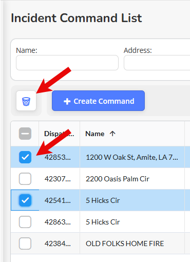 To bulk delete multiple incident commands, check the boxes next to each command you wish to delete, then select the bulk trash can icon at the top of the list.