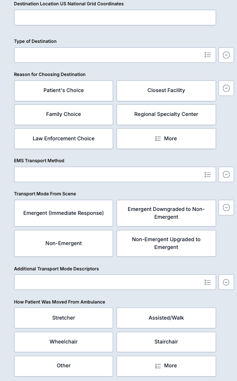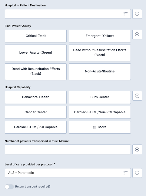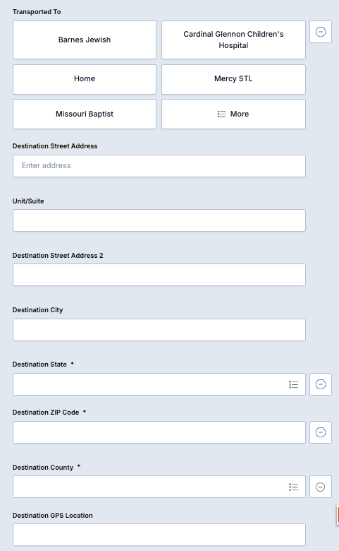 Transported To - Select the facility the patient is being transported to; Address information will auto-populate if built out in set up.