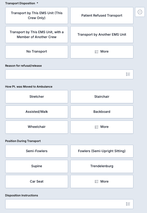 The Disposition section documents patient disposition throughout the incident. Complete the following fields as applicable: