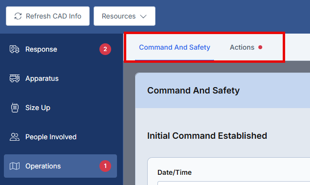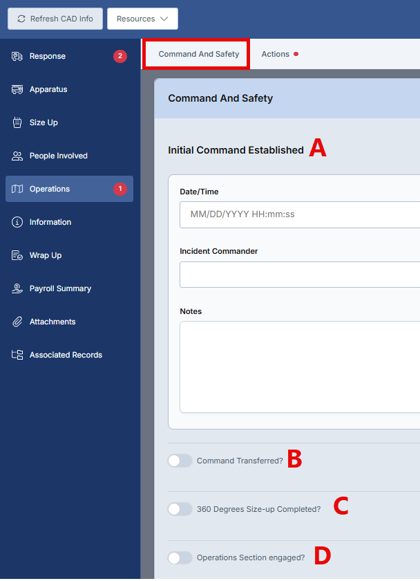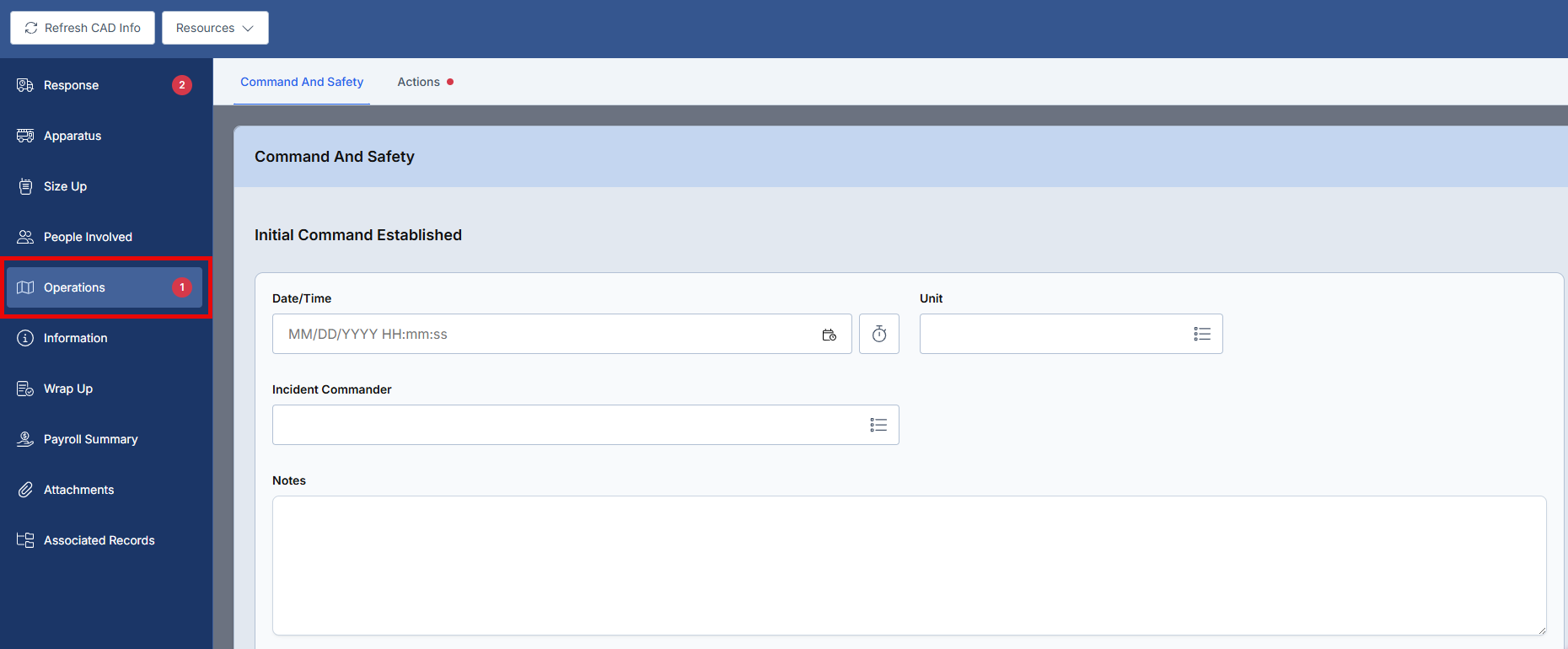 The Operations section is completed after the Scene Size-up section and represents a critical component of incident documentation. This section is divided into two primary fields: Command and Safety, and Actions. The Command and Safety field captures the incident command hierarchy, including command establishment, transfers, size-up activities, and operational structure. The Actions field documents the overall department response activities based on the incident type selected in the Response section.