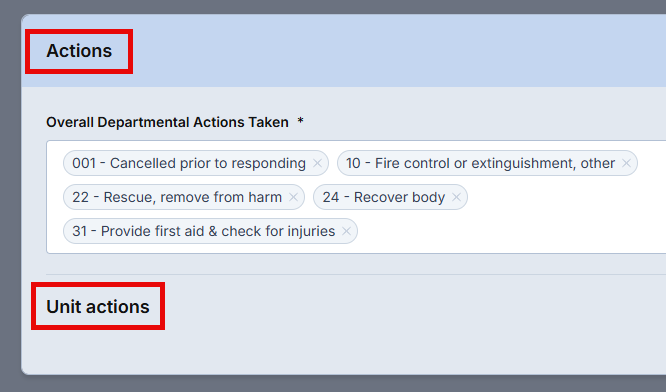 This documentation is essential for maintaining chain-of-command records, tracking operational decisions, and ensuring NFIRS compliance. The system automatically populates certain action options based on the incident type, streamlining documentation while maintaining accuracy. Only the first three actions selected are transmitted to NFIRS, ensuring compliance with reporting standards.