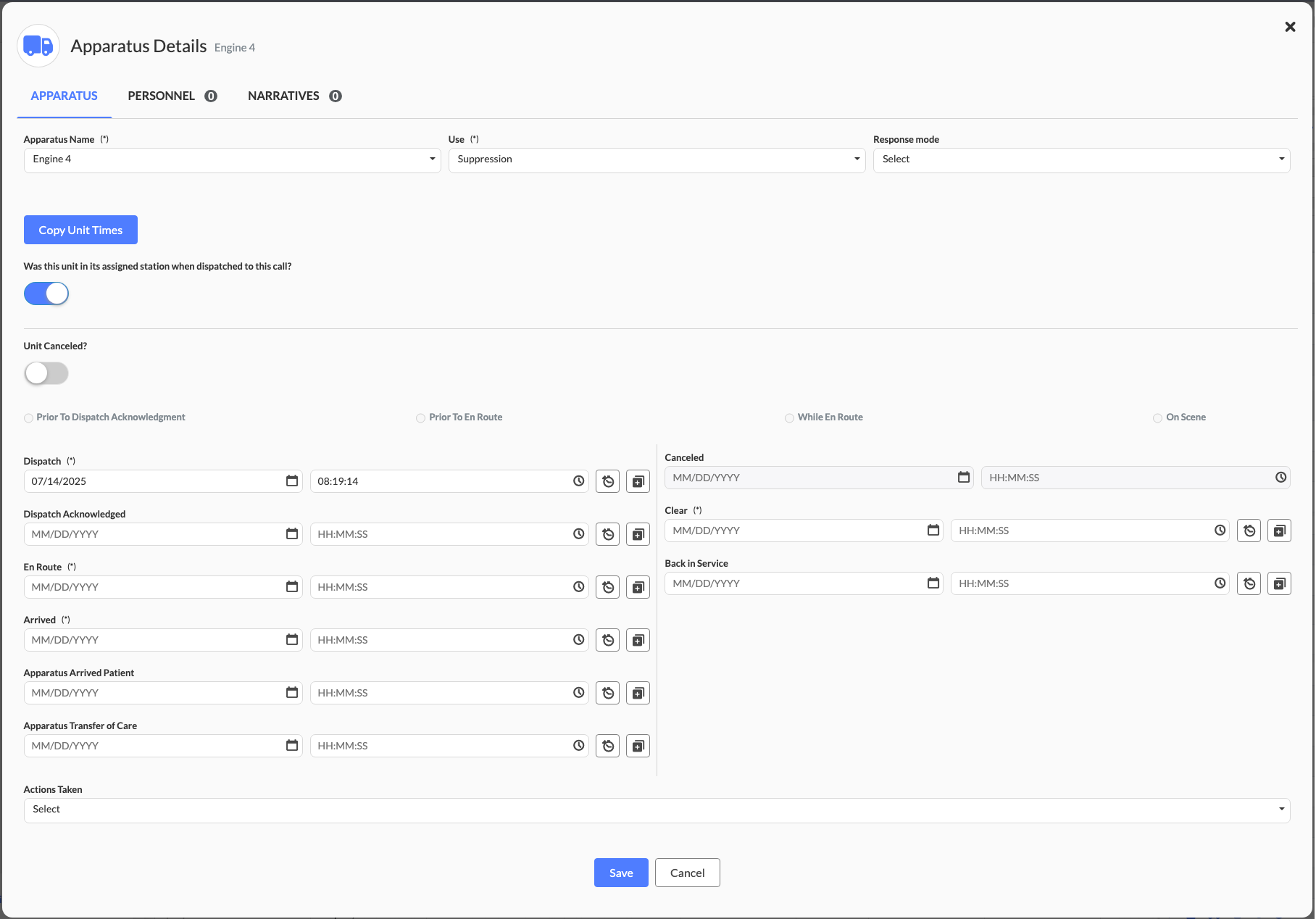 Canceled:The date and time the apparatus was canceled (only appears when "Unit Canceled?" is toggled on). Uses date picker and time selector.
