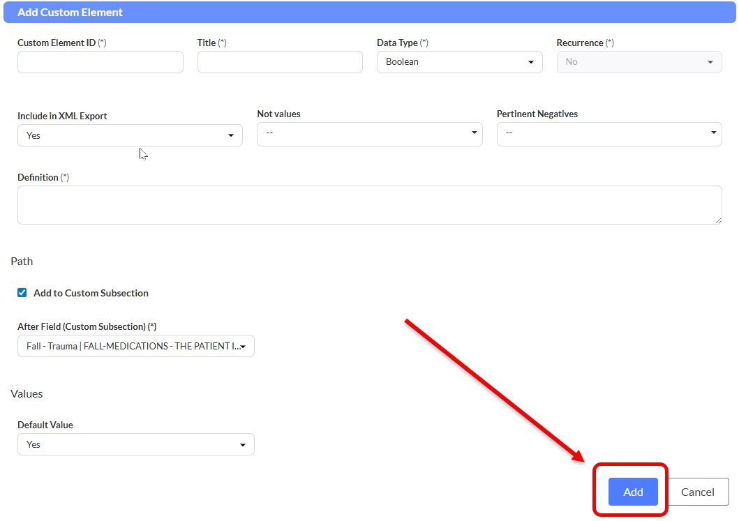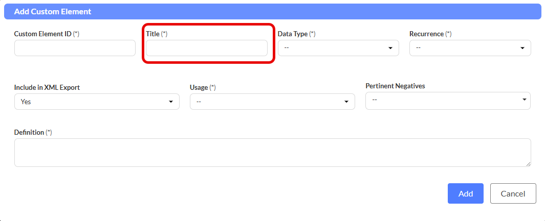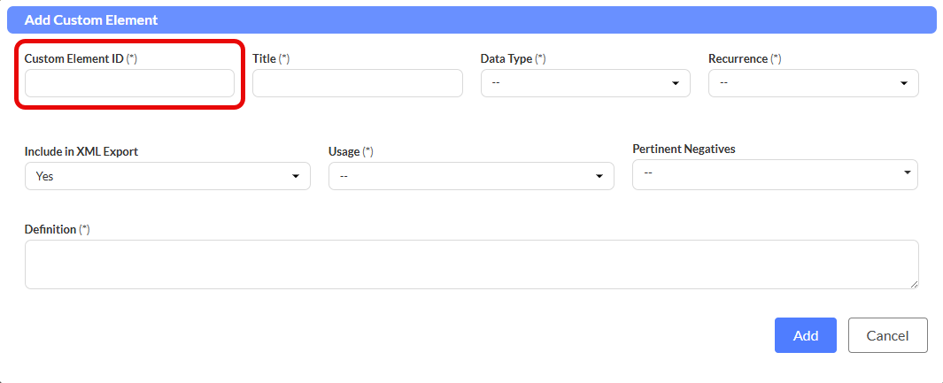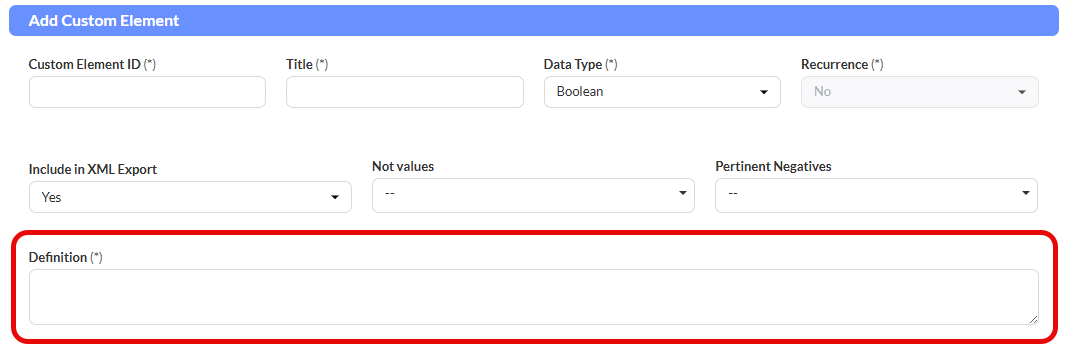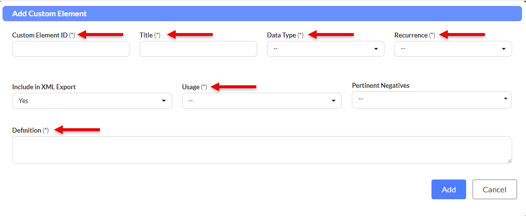 When adding Custom Elements, required fields will be identified by the (*) symbol. Ensure all required fields are completed before saving.