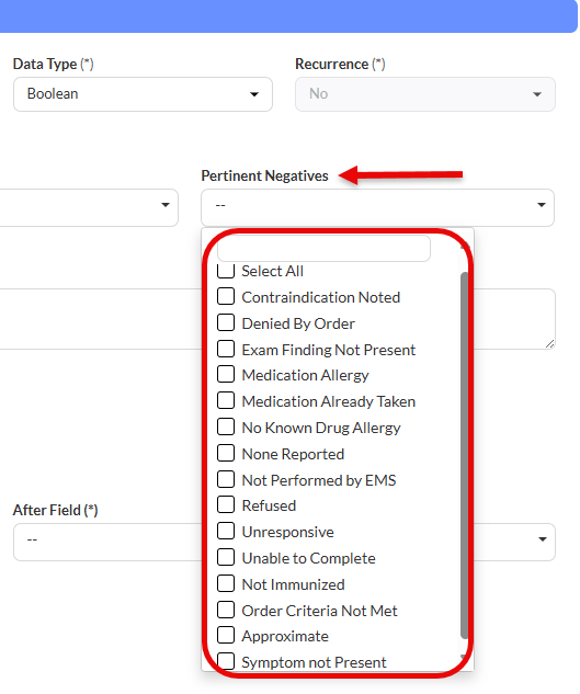 Set any Pertinent Negatives from the dropdown that should apply to the question being asked. These support clinical documentation standards.