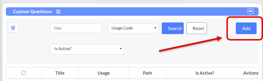 Select the Add button within the Custom Questions subsection to create a new custom element.