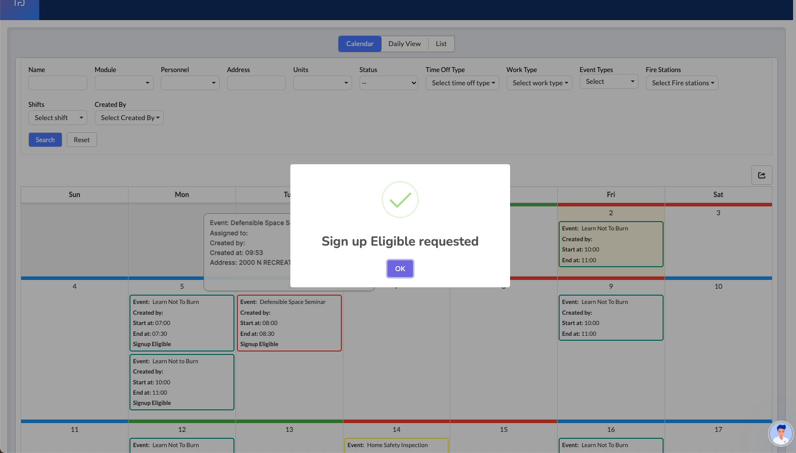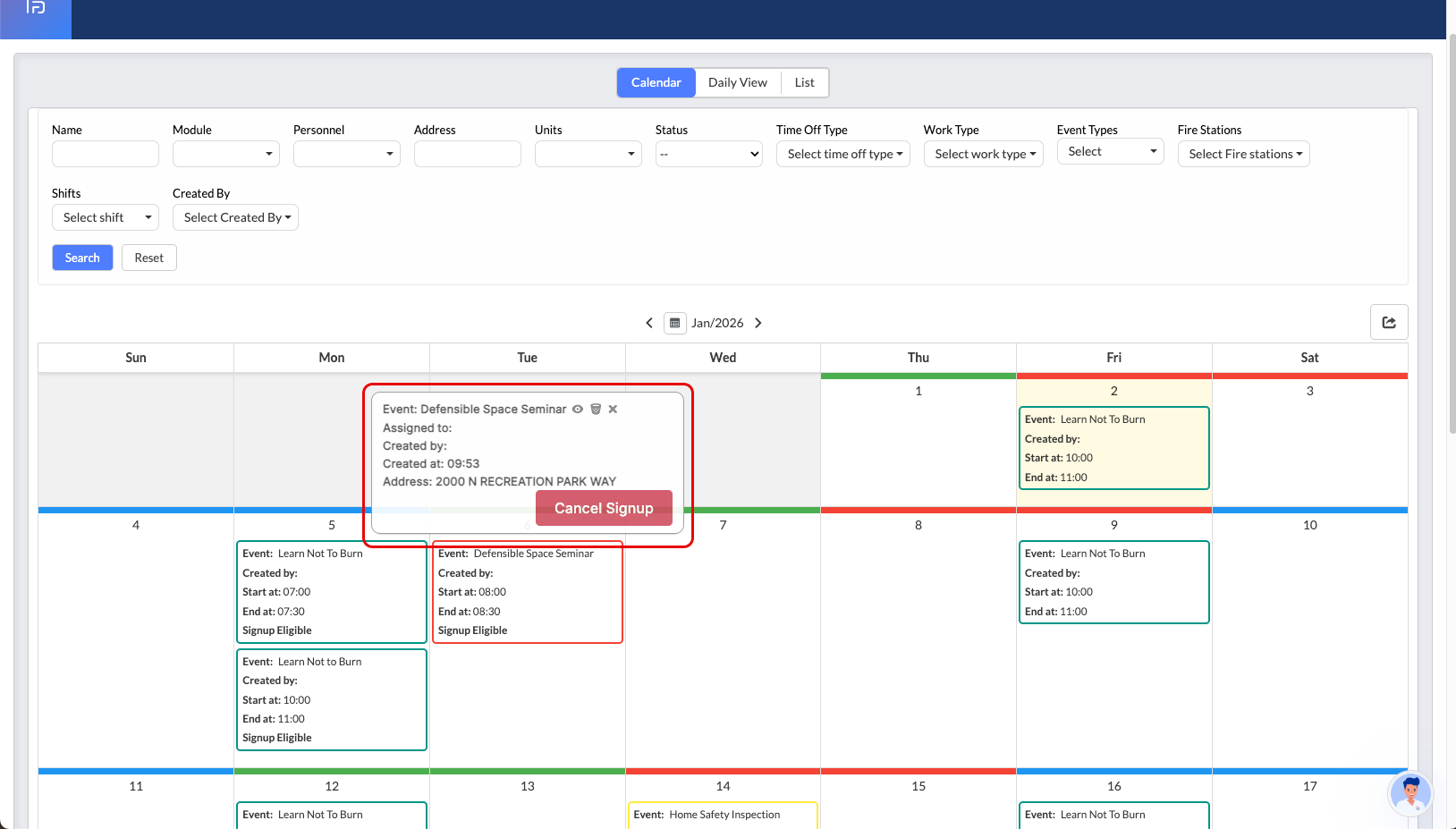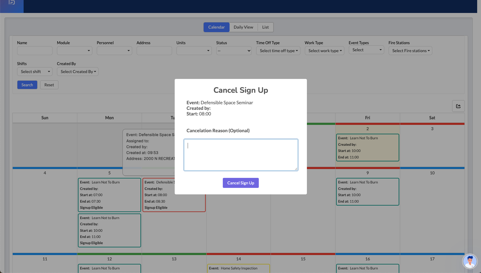 While events can be viewed from multiple Daily Operations views, the Sign Up functionality is exclusively available from the Calendar View. Once a user submits a sign-up request, the event creator must approve or deny the request before participation is confirmed.