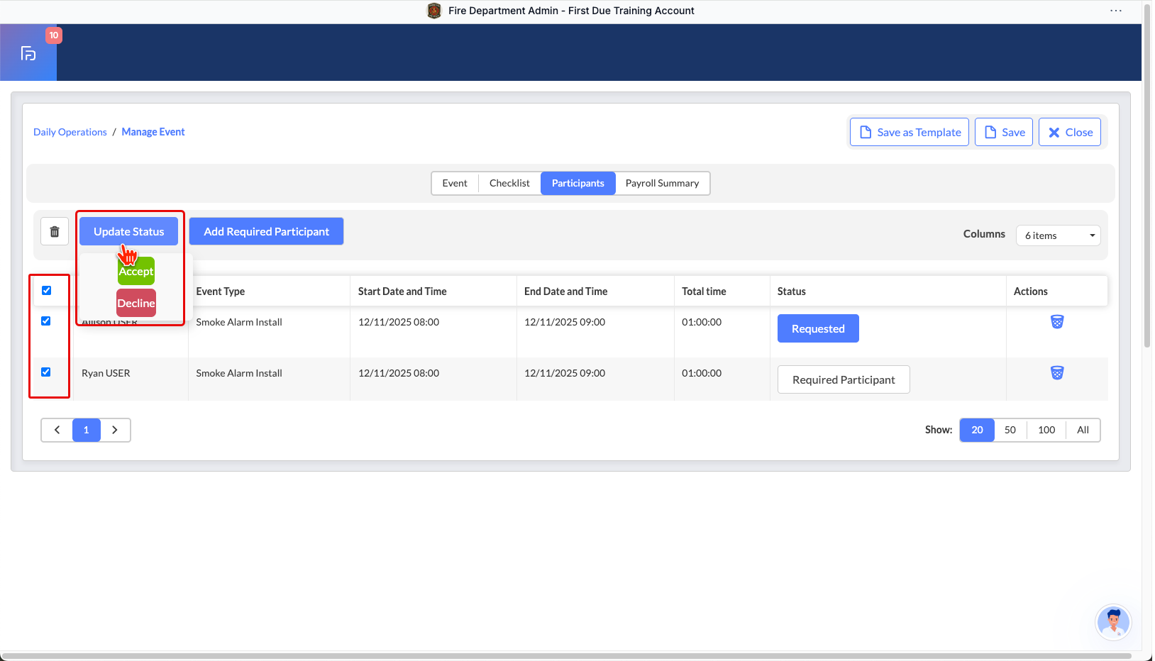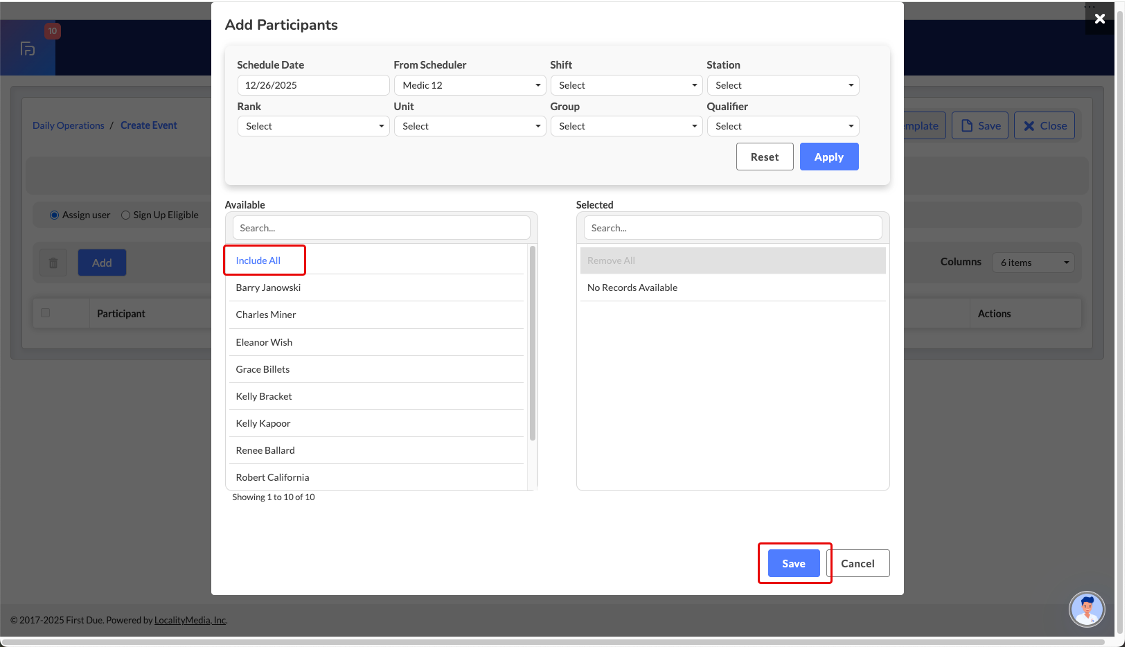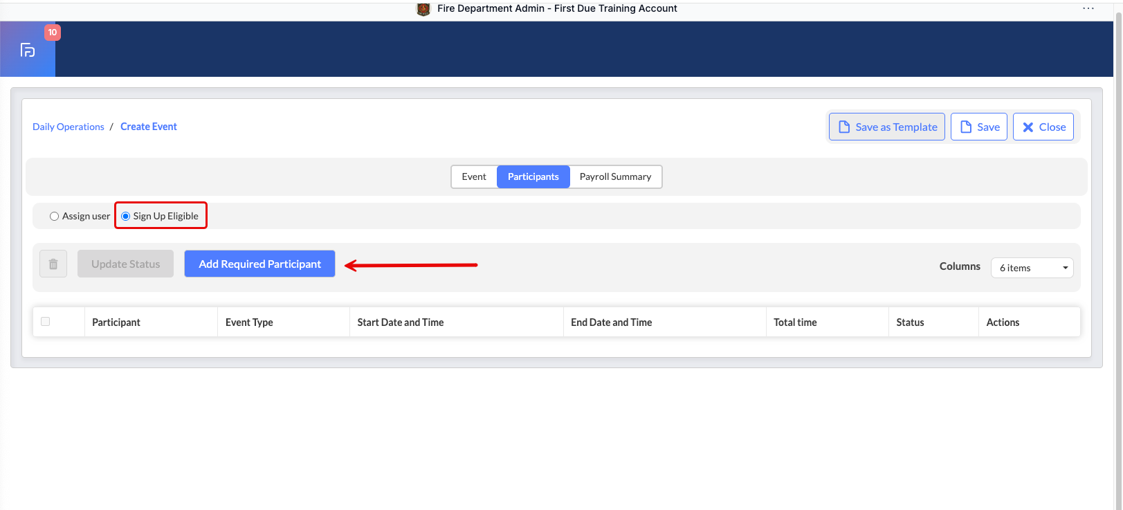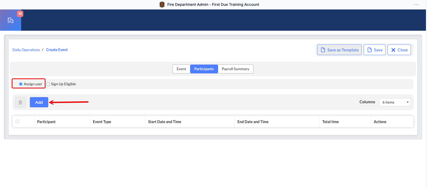 Participants represent department members who are involved in an event, such as training sessions, meetings, or operational activities. In First Due, participants can be added directly by the event creator or allowed to sign up through the calendar view, depending on how the event is configured.