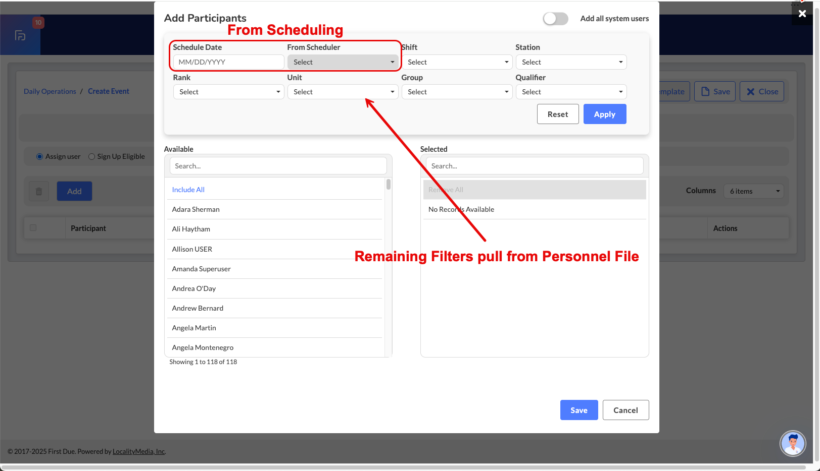 Participant data is pulled directly from personnel records and, when applicable, can be filtered using scheduling assignments. This allows departments to efficiently manage attendance, distinguish between required and voluntary participants, and maintain accurate records for reporting and accountability.