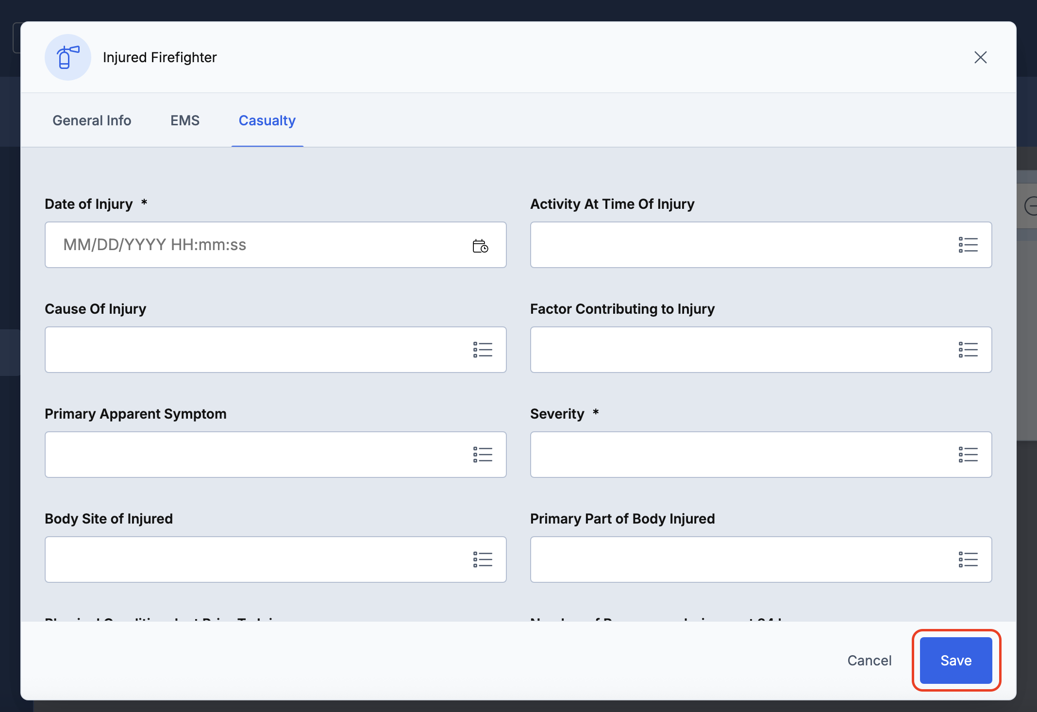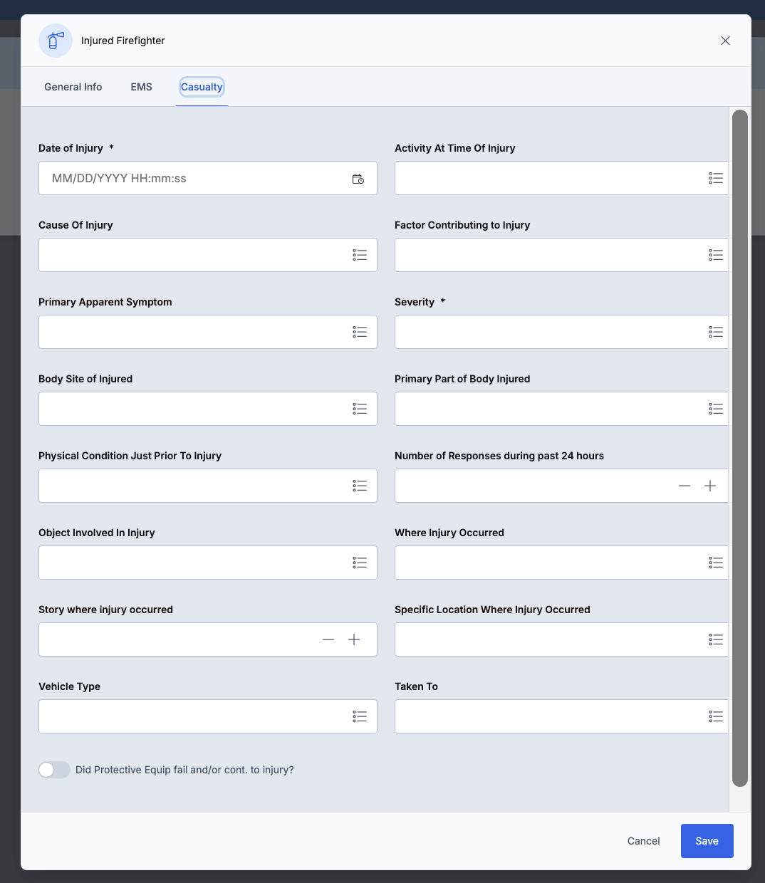 Q: Can I document multiple casualties in the same incident? A: Yes. Repeat the process for each injured firefighter by clicking "Add" in the People Involved section and creating separate casualty records.
